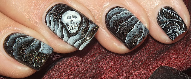 6. Huhh,én nem szeretem a koponyákat,de elismerem,nagyon jól sikerült a körmödön. Igazán bandisan és aprólékosan készítetted el,az indák hatalmasak,különösen érdekes,már-már hátborzongató a koponya mellett. Számomra kissé "szellemes";) hatása van,mintha tartanák a koponyát. Szép munka újfent!